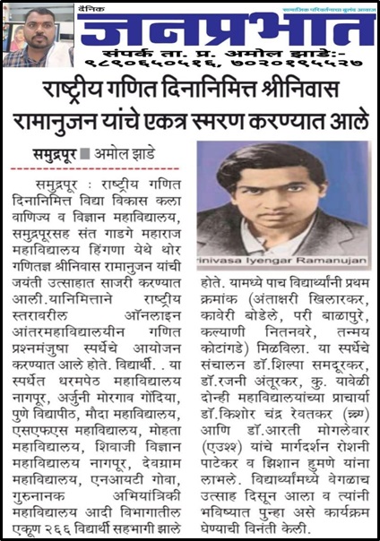 ![]() National Level Intercollegiate Online Math Quiz Competition on celebration of Mathematics Day Marathi News JANSATTA (24 December 2023) |